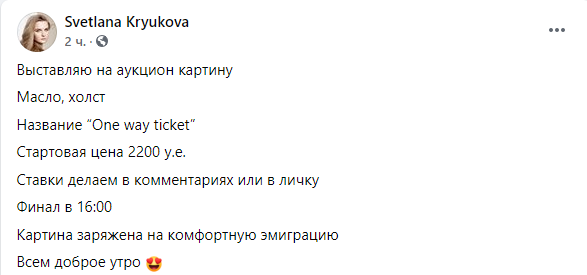 "Выставляю на аукцион картину. Масло, холст. Название "One way ticket". Стартовая цена 2200 у.е. Ставки делаем в комментариях или в личку", - говорится в сообщении.