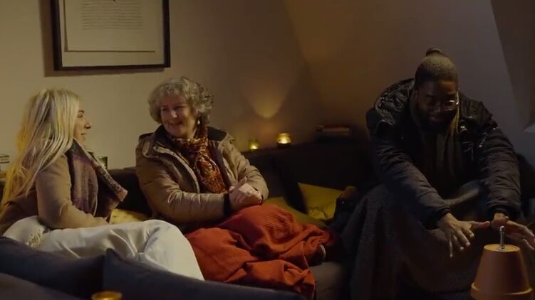Потом к ней приходят двое молодых людей, они тоже тепло одеты, все садятся на диван, укрываются пледами, греют руки у обогревателя из горшков, смеются и болтают. Все трое выглядят счастливыми и улыбаются.