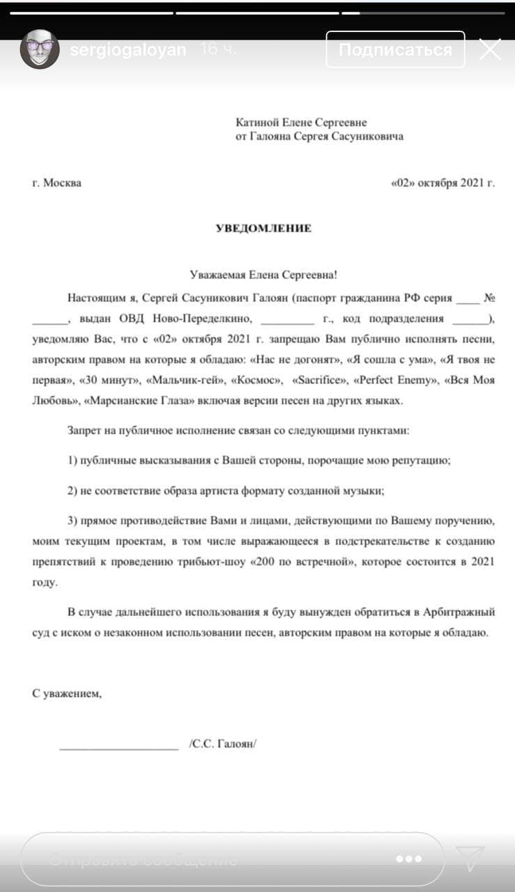 В сообщении Галояна говорится о том, что со 2 октября 2021 года девушке запрещено публично исполнять песни, авторским правом на которые он обладает. Речь идет об известных хитах группы "Нас не догонят", "Я сошла с ума", "Я твоя не первая", "30 минут", "Мальчик-гей", "Космос", "Sacrifice", "Perfect Enemy", "Вся моя любовь", "Марсианские глаза" включая версии песен на других языках.