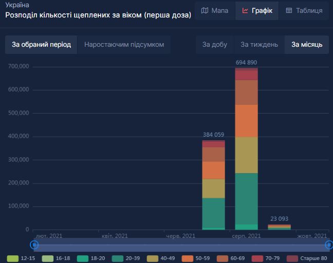 Судя по статистике, по состоянию на 6 октября в Украине второй дозой "Модерны", после которой наблюдались случаи миокардита, привили чуть более одного миллиона человек (примерно 1,1 млн).