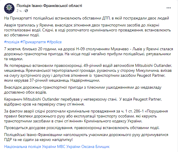 "49-летний водитель автомобиля Mitsubishi Outlander, житель Яремчанской территориальной общины, двигаясь в сторону Микуличин, выехал на полосу встречного движения и допустил столкновение с транспортным средством Peugeot Partner, которым управлял 37-летний житель Надвирнянщины. В результате дорожно-транспортного происшествия с телесными повреждениями в медучреждение доставлены оба водителя. Водитель Mitsubishi Outlander находился в нетрезвом состоянии. У водителя Peugeot Partner, отобраны кровь на проверку состояния опьянения", - говорится в сообщении полиции.