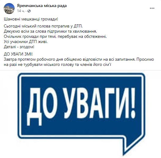 "Сегодня мэр попал в ДТП. Спасибо всем за слова поддержки и волнения. Глава общины в сознании, находится на обследовании. Все участники ДТП живы. Детали - впоследствии", - говорится в сообщении горсовета в соцсети.