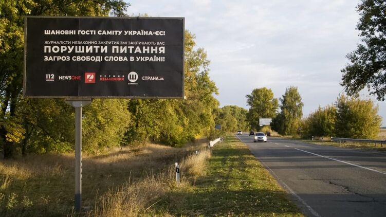 В Киеве, в преддверии саммита Украина-ЕС, который состоится 12 октября, журналисты незаконно заблокированных через санкции СНБО украинских медиа обратились к участникам саммита с помощью билбордов.