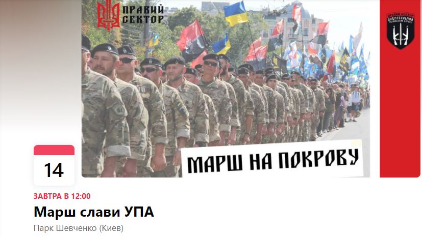 В "Правом секторе" шествие анонсируют под другим названием - не "Марш нации", а "Марш славы УПА". Программа такая: