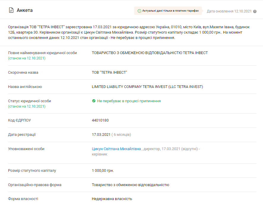 По данным госреестра, "Тетра Инвест" зарегистрирована 17 марта 2021 года, уставный фонд компании составляет 1 тысячу гривен. Собственник и директор компании - некая Светлана Цикун, которая является основателем семи компаний и директором трех предприятий.