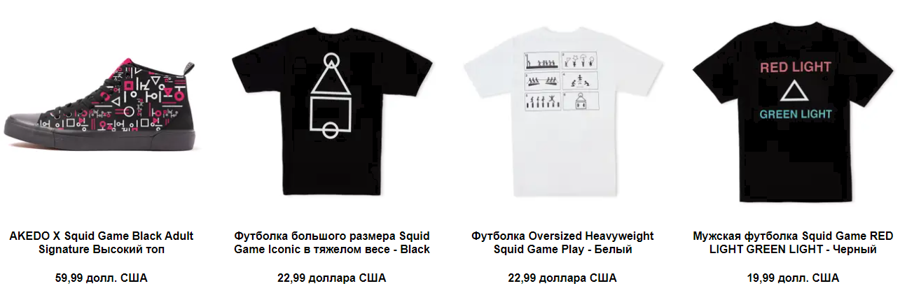 На Амазоне уже продается всё - от розовых комбинезонов (от 39,99 до 46,99 долларов) до масок (9,99 долларов), таргетированная реклама запущена. Костюмы игроков, в том числе и костюм главного героя с номером "456" можно купить от 13,32 до 49,99 долларов, слипоны Vans продают за 66,79 долларов.