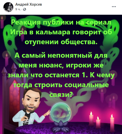 Основатель сервиса Opendatabot Андрей Хорсев пишет, что реакция публики на сериал "Игра в кальмара" говорит об отупении общества.