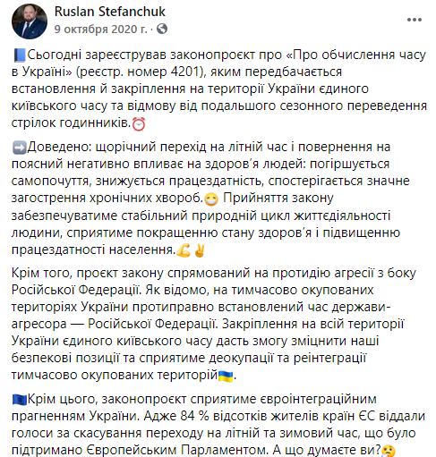 "Как известно, на временно оккупированных территориях Украины противоправно установленное время государства-агрессора - Российской Федерации. Закрепление на всей территории Украины единого киевского времени позволит укрепить наши оборонные позиции и будет способствовать деоккупации и реинтеграции временно оккупированных территорий", - писал он на своей странице в Facebook в октябре 2020 года.