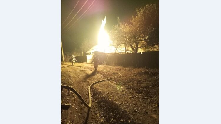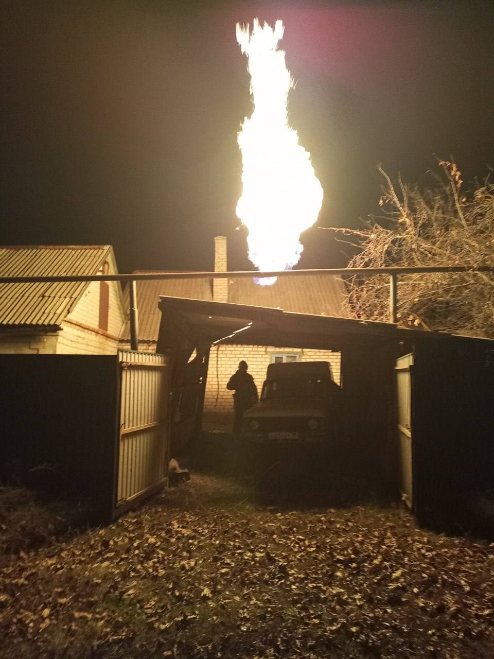 Столб пламени из газовой трубы и поврежденный осколками дом в Горловке. Фото: Телеграм