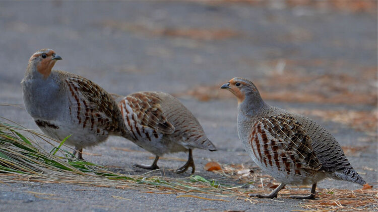 На снимке изображены три упитанные птицы серо-коричневого цвета. Серые куропатки - это небольшие птицы с телом округло формы, огни живут в открытой местности и ведут оседлый образ жизни, питаются семенами и насекомыми. Гнезда строят на земле.