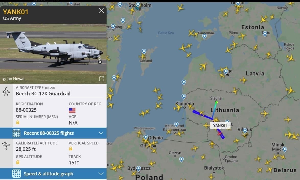 В этот же день сервисы, отслеживающие авиационный трафик, сообщили о появлении американского самолета-разведчика у границ Беларуси, а также Калининградской области России. Самолет пролетел через Литву.