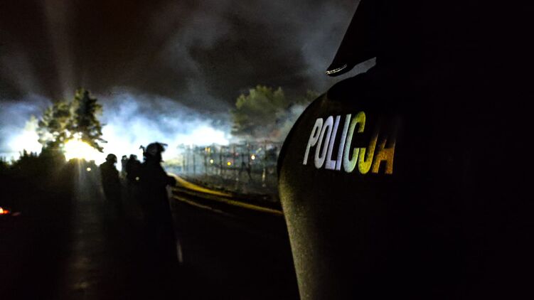 "Камни полетели из Беларуси в сторону правоохранителей. Был сбит полицейский и повреждена полицейская машина. К счастью, у полицейского был шлем на голове, чтобы защитить его", - сообщили в полиции.