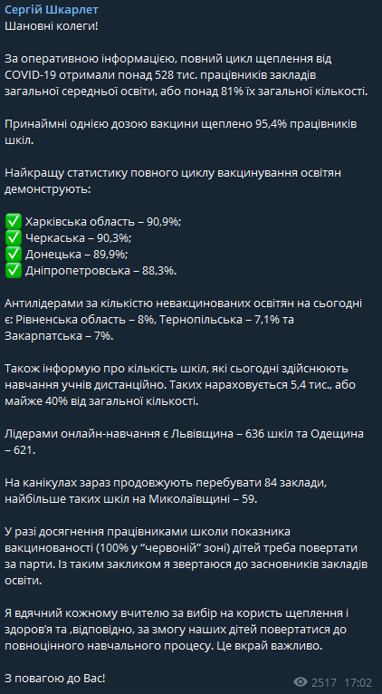 "Таких насчитывается 5,4 тыс. или почти 40% от общего количества. Лидерами онлайн-обучения Львовщина – 636 школ и Одесщина – 621 школ. На каникулах сейчас продолжают находиться 84 заведения, больше таких школ на Николаевщине - 59", - пишет он.