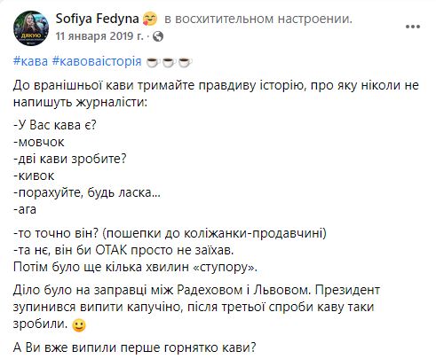 "Президент остановился выпить капучино на заправке на трассе между Радеховом и Львовом. После третьей попытки кофе таки сделали", - написала тогда Федина в Facebook.