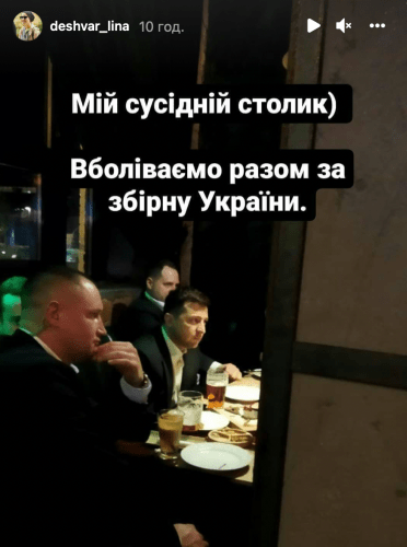 Но более интересной оказалось соседство Зеленского с киевской активисткой Линой Дешвар. Она тоже запостила сторис о том, что ее столик оказался рядом с президентским.