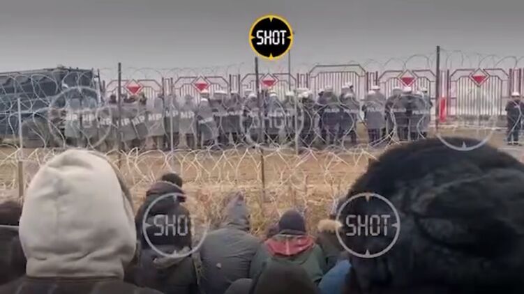 На опубликованном в сети видео можно рассмотреть, как беженцы, стоя на коленях и взывают о помощи. Польские силовики, которые подогнали на свои позиции водомет, наблюдают за ситуацией.
