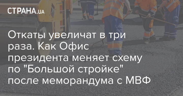 "По той информации, что просачивается по итогам переговоров дорожников в ОП, хотят увеличить откаты с 10% до 10-30% - в зависимости от проекта, самой фирмы и т.д. То есть, сумма для каждого будет разной. Кроме того, по моим данным, хотят изменить каналы передачи денег. Но как именно - точной информации пока нет", — подытожил источник.