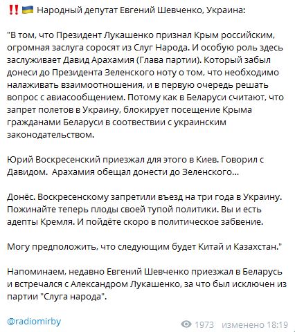 "В том, что президент Лукашенко признал Крым российским, огромная заслуга соросят из Слуг Народа. И особую роль здесь заслуживает Давид Арахамия, который забыл донеси до президента Зеленского ноту о том, что необходимо налаживать взаимоотношения, и в первую очередь решать вопрос с авиасообщением. Потому как в Беларуси считают, что запрет полетов в Украину, блокирует посещение Крыма гражданами Беларуси в соответствии с украинским законодательством.