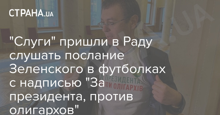 В среду, 1 декабря, в день выступления президента Украины Владимира Зеленского в Верховной Раде, некоторые депутаты фракции "Слуга народа", как и анонсировала "Страна", пришли в футболках с надписью "За президента, против олигархов".