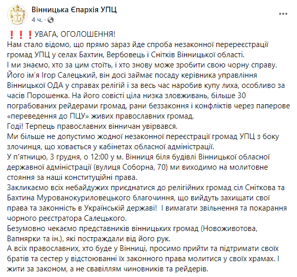 "Нам стало известно, что прямо сейчас идет попытка незаконной перерегистрации общин УПЦ в селах Бахтын, Вербовец и Снитки Винницкой области. И мы знаем, кто за этим стоит, и кто снова может сделать свое черное дело.