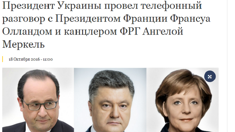 "Отфотошопленную" фотографию Меркель выставили на сайте президента в качестве иллюстрации к новости "Президент Украины провел телефонный разговор с Президентом Франции Франсуа Олландом и канцлером ФРГ Ангелой Меркель". На фото отредактированы возрастные несовершенства, а лицо Меркель выглядит уже, чем на оригинальном фото. В результате обработки в фоторедакторе изменился также цвет и структура лацкана пиджака (см. коллаж).