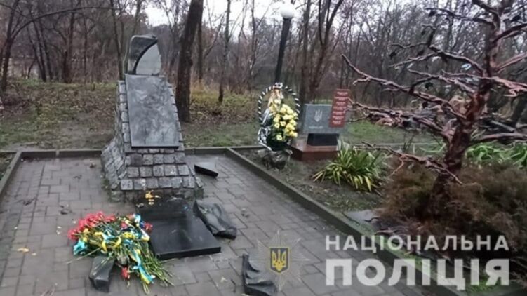 "Около 7:20 в райотдел полиции поступило сообщение от начальника управления ЖКХ Первомайска о том, что в центре города, возле остановки общественного транспорта по ул. Грушевского, неизвестные повредили и осквернили надписями мемориал героям Небесной Сотни и воинам АТО", - говорится в сообщении.