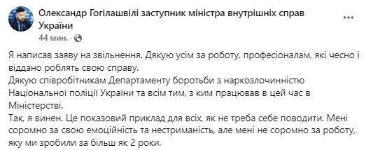 Александр Гогилашвили, который 11 декабря устроил скандал и обматерил полицейских на блокпосте в Донецкой области, написал заявление об отставке с поста замминистра внутренних дел. Об этом он сообщил в соцсети.