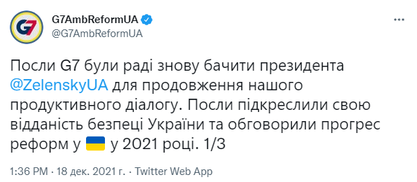 "Послы G7 были рады снова видеть президента Украины для продолжения нашего продуктивного диалога. Послы отметили свою приверженность безопасности Украины и обсудили прогресс реформ в Украине в 2021 году", — говорится в сообщении.