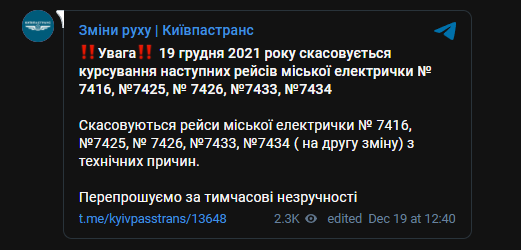 "19 декабря 2021 года отменяется курсирование следующих рейсов городской электрички № 7416, № 7425, № 7426, № 7433, № 7434.