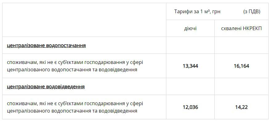 • централизованное водоснабжение - 16,164 грн/кубометр с НДС;