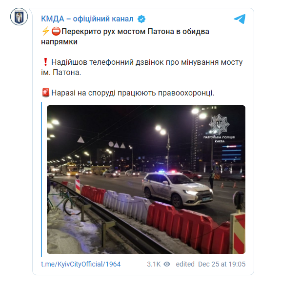 "Внимание! Поступило сообщение о минировании моста Патона. Движение в обоих направлениях временно ограничено", говорится в сообщении.
