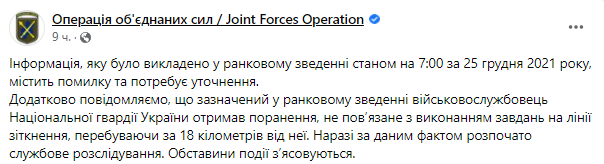 "Указанный в утренней сводке военнослужащий Национальной гвардии Украины получил ранение, не связанное с выполнением заданий на линии столкновения, находясь в 18 километрах от нее", - говорится в сообщении.