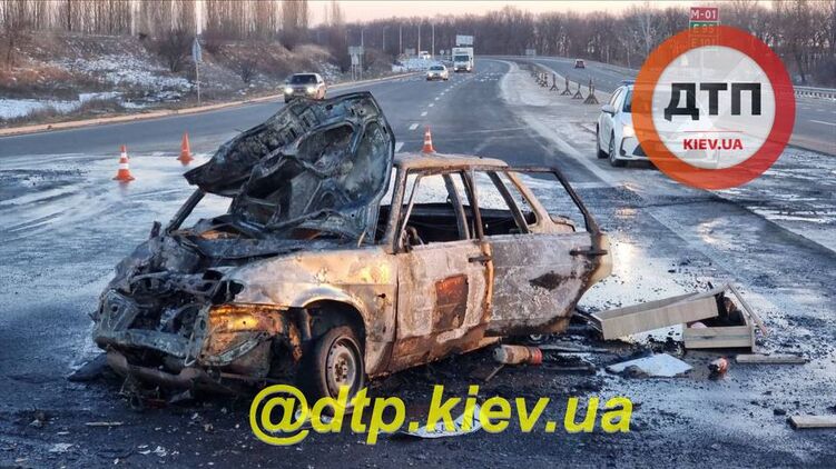Под Киевом произошла авария, в результате которой сгорел автомобиль. Фото: dtp.kiev.ua