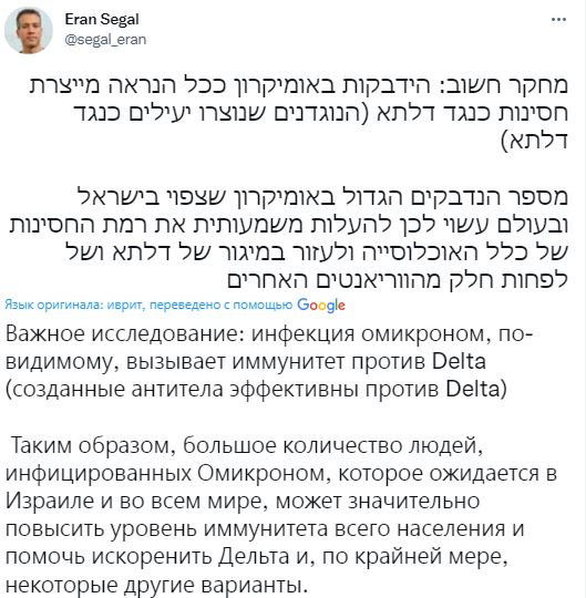 Комментируя американское исследование, профессор Эран Сегаль из Института Вейцмана в Израиле предположил, что большое количество случаев заражения "Омикроном" может дать возможность приобрести тот самый коллективный иммунитет, о котором многие говорят.
