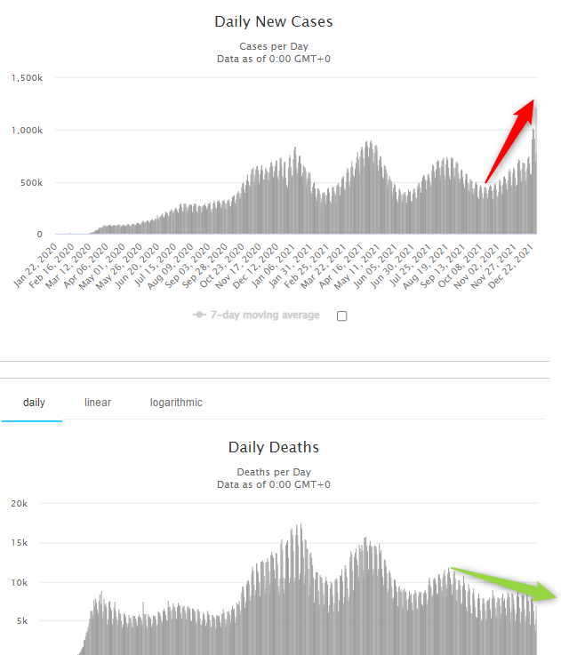 В целом по миру наблюдается рост заболеваемости (красная стрелка) с переходом за миллион заболевших в сутки. И легкое падение смертности (зеленая стрелка).