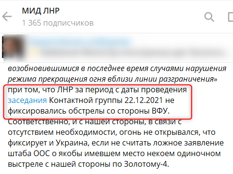 "ЛНР за период с даты проведения заседания Контактной группы 22.12.2021 не фиксировались обстрелы со стороны ВФУ (Вооруженных формирований Украины, так в Луганске называют ВСУ - Ред.)", - говорится в сообщении "МИД ЛНР".