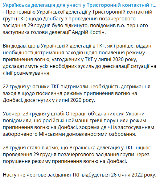 28 декабря украинская делегация в Трехсторонней контактной группе призвала провести экстренное заседание. Причина - сообщение ВСУ от 23 декабря о трех нарушениях огня со стороны "российских наемников".