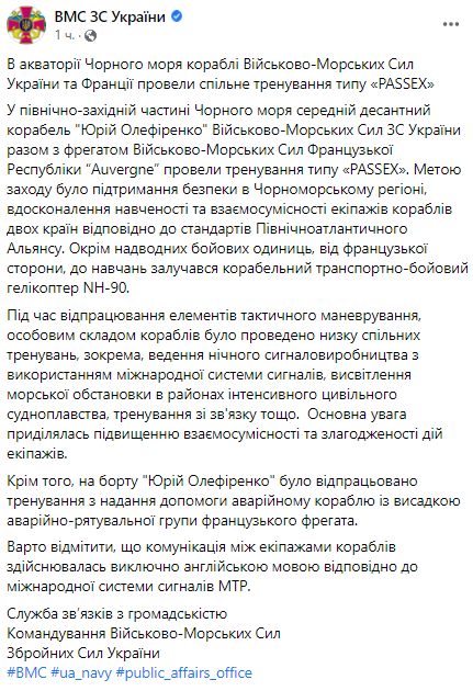 "В северо-западной части Черного моря средний десантный корабль "Юрий Олефиренко" ВМС ВСУ вместе с фрегатом ВМС Франции "Auvergne" провели тренировку типа "PASSEX". Целью мероприятия было поддержание безопасности в Черноморском регионе, совершенствование подготовки и совместимости экипажей кораблей двух стран в соответствии со стандартами Североатлантического Альянса", - говорится в сообщении.
