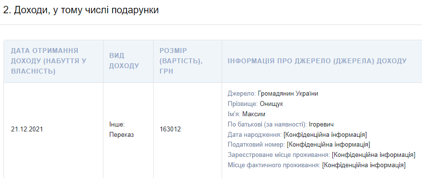 Уже 21 декабря Хомчак обновил данные декларации, указав, что перевел 163 012 гривень своему родственнику - Максиму Онищуку.
