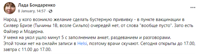 "Народ, у кого возникло желание сделать бустерную прививку - в пункте вакцинации в Силвер Бризе (Тычины 1В, возле Сильпо) очередей нет, от слова "вообще пусто". Зато есть Файзер и Модерна.