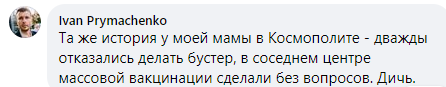 "Та же история у моей мамы в Космополите - дважды отказались делать бустер, в соседнем центре массовой вакцинации сделали без вопросов. Дичь", - комментирует пользователь Facebook Иван Примаченко.