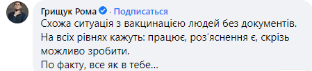 "Похожая ситуация с вакцинацией людей без документов. На всех уровнях говорят: работает, разъяснения есть, везде можно сделать. По факту, все как у тебя...", - пишет нардеп Роман Грищук в ответ на историю Щербины.