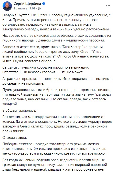 "Получил "бустерный" Pfizer. К своему глубочайшему удивлению, с боем. Причём, что интересно, на центральном уровне всё организовано прекрасно - вакцины завались, запись в электронную очередь, центры вакцинации удобно расположены.