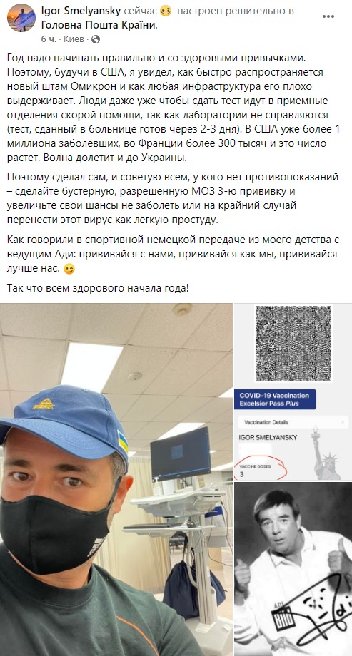 Руководитель "Укрпочты" Игорь Смелянский тоже начал 2022 год с укола бустером.