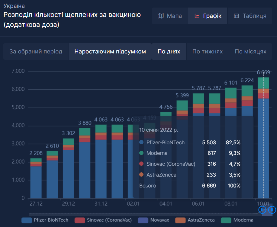 СНБО дает общую статистику и по бустеру, и по второй дозе для льготных категорий. С 13 декабря всего третий раз укололось 6 669 человек. Это чуть более 200 человек в день. При этом в Украине 14 миллионов человек имеют право на бустер - они прошли полный курс вакцинации.