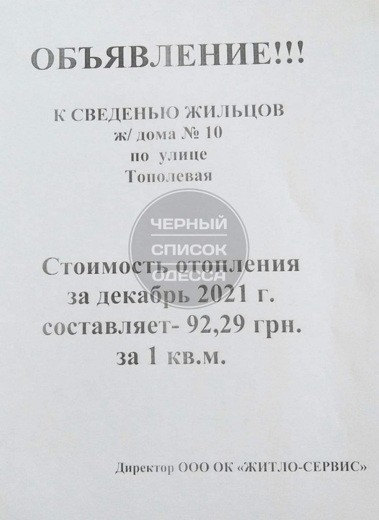 В сети обсуждают объявление, появившееся в одном из районов Одессы. Компания "Житло-Сервис" уведомляет жильцов о космическом тарифе за отопление, составляющем 92 грн 29 копеек за квадратный метр. Таким образом проживающим в этом районе одесситам за отопление в трехкомнатной квартире придется выложить 5700 грн.