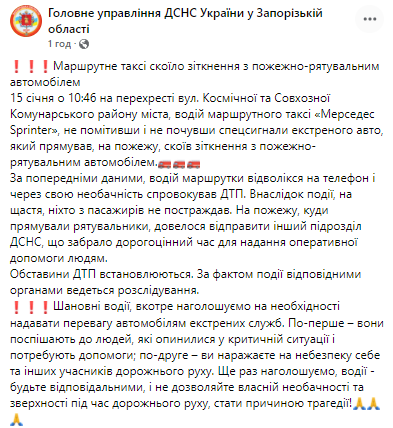 "15 января в 10:46 на перекрестке ул. Космической и Совхозной, Коммунарского района города (Запорожье - Ред.), водитель маршрутного такси "Мерседес Sprinter", не заметив и не услышав спецсигналы пожарно-спасательного автомобиля, следовавшего на пожар, совершил столкновение с ним", - говорится в сообщении.