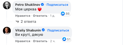 Сотрудник одного из СМИ Петр Шуклинов и "антикоррупционер" Виталий Шабунин поддержали позицию, указав смайл-сердечко и слова в адрес ПЦУ: "Вы крутые".