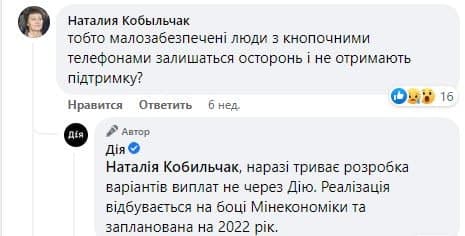 "То есть малообеспеченные люди с кнопочными телефонами останутся в стороне и не получат помощь?", - интересовалась пользователь Наталья Кобыльчак.