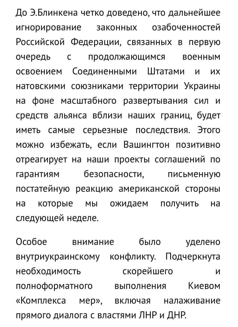 3. Москва на следующей неделе ждет письменного ответа от США, причем именно постатейную реакцию на российские предложения, выдвинутые в декабре.